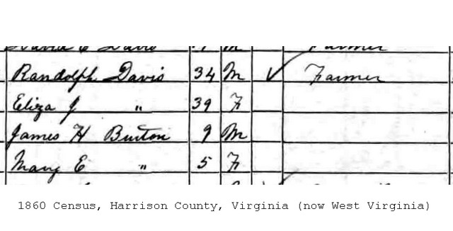M Child 1: James H. (Burton) Davis [parents are foster parents] Census name: James H. Burton 2,4 Born: Sep-14-1851 at Bristol, Harrison Co, (W)VA 5 Died: Aug-12-1936 at Saltwell, Harrison Co, WV 6 Census: 1900 in McClellan District, Doddridge Co, WV Census: 1880 in Grant District, Doddridge Co, WV Census: 1870 in Tenmile District, Harrison Co, WV Census: 1860 in Harrison Co, (W)VA Wife: Lucy Ann Clark b. Nov-30-1848 d. Apr-30-1900 Married: Oct-30-1872 in Doddridge Co, WV 7,8