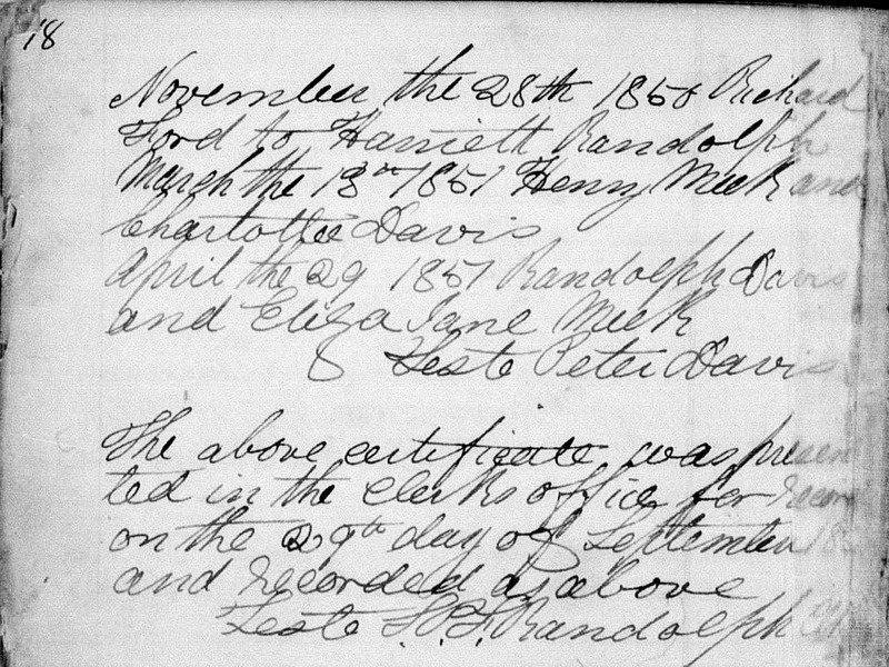 Sources: (1) Susie Davis Nicholson, Davis - The Settlers of Salem, West Virginia, Gordon Printing Co, Strasburg OH, 1979 (Revised & Enlarged) < www.wvgenweb.org/harrison/books.htm >, p. 61. (2) 1860 Census, Harrison County, (W)VA. (3) Doddridge County Marriage Records, West Union, WV, There are two entries for this marriage, the first pertaining only to the issuance of the license: Randolph Davis, 21, son of (blank); and Eliza J. Meek, 18, dau of Montecue Meek. Marriage license issued on Apr 22 1851. The second entry, pertaining to the marriage itself, states only that Randolph Davis and Eliza Jane Meek were married on Apr 29 1851. (4) 1870 Census, Harrison County, WV. (5) Harrison County Death Records, Clarksburg, WV. (6) Harrison County Death Records, Clarksburg, WV, Identified as James Henry Davis, b. Sep 14 1851 at Bristol, d. Aug 12 1936 at Saltwell, age 84y 10m 28d, farmer, widower, son of Charles Davis (b. West Union WV) & Hannah Buck (b. Rock Camp WV), buried at Shinnston. Informant: W. M. Davis, Shinnston. (7) Doddridge County Marriage Records, West Union, WV, Identified as James Davis, 21, b. Doddridge Co, res. Harrison Co, son of Randolph & Hannah Davis; and Lucy Ann Clark, 22, b. & res. in Doddridge Co, dau of Jesse & Charlotte Clark. Married Oct 30 1872 by Lewis F. Randolph. MR p. 192. (8) Susie Davis Nicholson, Davis - The Settlers of Salem, West Virginia, Gordon Printing Co, Strasburg OH, 1979 (Revised & Enlarged) < www.wvgenweb.org/harrison/books.htm >, p. 109. (9) WV State Dept of Health, Div of Vital Statistics, Death Certificate (http://www.wvculture.org/vrr/va_dcsearch.aspx) (10) Obituary of son. (11) Marriage record of daughter. (12) Harrison County Marriage Records, Clarksburg, WV, Identified as Camden F. Randolph, widowed, 45, b. & res. Harrison Co, son of Peter & Maria F. Randolph, occupation farmer; and Mary Ferry (sic), widowed, 31, b. & res. Harrison Co, dau of Unknown. Married Jun 10 1886 in Clarksburg. Although the marriage certificate indicates the bride's parents as "Unknown," and the corresponding marriage index/ledger indicates the same, the ledger entry also contains the following statement in the Remarks column: "Note from Father and Mother for daughter." Event Notes Note (1) Cherry Camp RunName Index