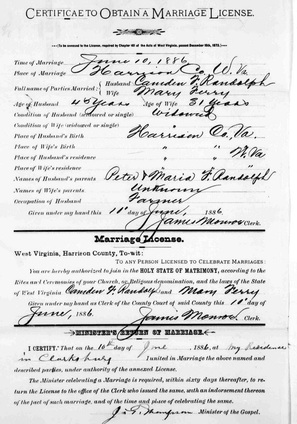 Sources: (1) Doddridge County WV Marriages 1845-1937, Wes Cochran, 156 Gihon Meadows, Apt 150, Parkersburg, WV 26101 (Jan 1993) (2) Death record of wife. (3) 1860 Census, Harrison County, (W)VA. (4) Harrison County Marriage Records, Clarksburg, WV, Identified as Camden F. Randolph, widowed, 45, b. & res. Harrison Co, son of Peter & Maria F. Randolph, occupation farmer; and Mary Ferry (sic), widowed, 31, b. & res. Harrison Co, dau of Unknown. Married Jun 10 1886 in Clarksburg. Although the marriage certificate indicates the bride's parents as "Unknown," and the corresponding marriage index/ledger indicates the same, the ledger entry also contains the following statement in the Remarks column: "Note from Father and Mother for daughter." (5) Susie Davis Nicholson, Davis - The Settlers of Salem, West Virginia, Gordon Printing Co, Strasburg OH, 1979 (Revised & Enlarged) < www.wvgenweb.org/harrison/books.htm >, p. 61. (6) WV State Dept of Health, Div of Vital Statistics, Death Certificate (http://www.wvculture.org/vrr/va_dcsearch.aspx) (7) Obituary of son. (8) Findagrave.com. (9) Headstone (year only) (10) West Virginia Marriages Index, 1785-1971 [database on-line], Ancestry.com.Name Index