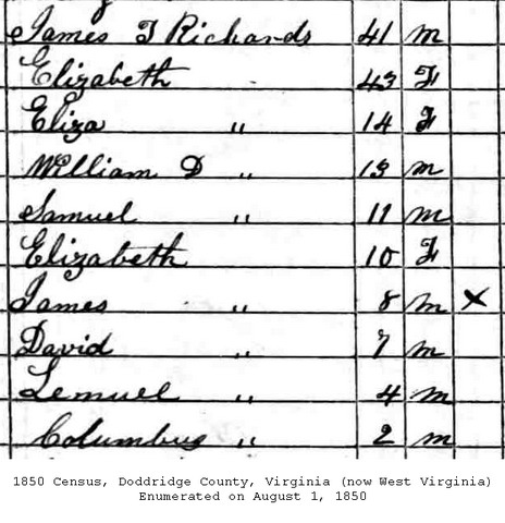 M Child 2: William D. Richards Born: ca 1837 1 Census: 1850 in Doddridge Co, (W)VA