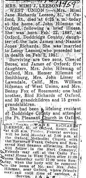 Sources: (1) Obituary. (2) 1900 Census, Doddridge County, WV (Southwest District) (3) Headstone (year only) (4) Obituary - At home. (5) Obituary of wife. (6) Headstone. (7) Obituary of sister. (8) Obituary of husband. (9) Obituary of daughter. (10) Dolores Leeson "Dee" Dawson, Circleville, OH. (11) Doddridge County WV Marriages 1845-1937, Wes Cochran, 156 Gihon Meadows, Apt 150, Parkersburg, WV 26101 (Jan 1993), Identified as Leroy Leeson, 29, of Doddridge Co; and Jemima Richards, 23, of Doddridge Co. Married Aug 19 1900. (12) Obituary, Undated obituary clipping from a Friday newspaper states only that she "died at 6:25 a.m. today at the home of John Hileman of Oxford," at age 81. (13) Headstone, Name appears as "Sissie Leeson" (14) Ritchie County Historical Society (David M. Scott, Editor), Ritchie County, West Virginia Cemeteries through 1993, McClain Printing Co, Parsons, WV, 1995. (15) Obituary of father. (16) Obituary of mother. (17) Ritchie County WV Marriages 1916-1945, Wes Cochran, 2515 10th Ave, Parkersburg WV 26101 (Sep 1998) (18) Doddridge County Court House, West Union, WV, DR Bk 6, p. 77. (19) Hileman Genealogy (1305) 1780-1981, Pearl Hileman Cooper and Maysel Hileman Pierce (self-published, 1981), p. 38. (20) Doddridge County WV Marriages 1845-1937, Wes Cochran, 156 Gihon Meadows, Apt 150, Parkersburg, WV 26101 (Jan 1993) (21) Doddridge County Birth Records, West Union, WV, Birthplace indicated only as Big Springs, WV. The only Big Springs found in West Virginia is in Calhoun County. Obituary gives birthplace only as Calhoun Co, WV. Reason for the birth being recorded in Doddridge Co is not known. BR Bk 4, p. 100. (22) Obituary - Camden-Clark Memorial Hospital. (23) Social Security Death Index. (24) Death record of son. (25) Doddridge County Marriage Records, West Union, WV, Groom identified as James Leeson, age 26, b. Doddridge Co, resident of Oxford. Bride identified as Rachel Pierce, age 19, b. Doddridge Co. Ceremony held Apr 2 1932. MR Bk 12, p. 463. (26) Obituary of brother. (27) Harrison County Marriage Records, Clarksburg, WV. (28) Obituary - United Hospital Center. (29) Death record of husband. (30) Harrison County Marriage Records, Clarksburg, WV, Identified as Rolland Glen Moore, single, 24, b. Sep 23 1922 at Bristol, res. Bristol, son of Austin M. & Iva Myrtle (Lattea) Moore; and Pearl Edna Leeson, single, 32, b. Aug 18 1913 at Oxford, res. Bristol, dau of Roy & Jane (Richard) Leeson. Married Apr 24 1946 at Bristol, officiated by H. R. Mahon, a Minister of the Methodist Church. MR p. 145 : www.wvculture.org/vrr/va_view.aspx?Id=177315&Type=Marriage. (31) Harrison County Marriage Records, Clarksburg, WV, Identified as John Augustine Limer, widowed, 38, b. Jul 10 (sic) 1910 in Clarksburg, res. Clarksburg, son of Percy & Lillie Mae (Campbell) Limer; and Pearl Edna Leeson Moore, widowed, 35, b. Aug 18 1913 at Oxford, res. Bristol, dau of Roy & Mary (Richards) Leeson. Married Jan 20 1949 in Clarksburg, officiated by John E. Hanifan, a Minister of the Methodist Church. (NOTE: Husband's stated birth date is incorrect. His previous marriage record, obituary and SSDI indicate Jul 9 1910.), MR p. 369 : www.wvculture.org/vrr/va_view.aspx?Id=176555&Type=Marriage. (32) Doddridge County Death Records, West Union, WV, DR Bk 7, p. 60. (33) Doddridge County Marriage Records, West Union, WV, MR Bk 13, p. 118. (34) Birth record of daughter. (35) Birth record of son. (36) Death record of daughter. (37) 1920 Census, Doddridge County, WV (Southwest District). (38) Doddridge County Marriage Records, West Union, WV, He was identified as W.M. Hileman, age 47, b. Oxford, WV, son of I.L. & Julia Hileman; and she as Goldie Jones, age 33, b. Oxford, dau of Ray & Minnie Jane Leeson. MR Bk 16, p. 186. (39) Harrison County Marriage Records, Clarksburg, WV, Consent for issuing license given by J. C. Smith, guardian of Benjamin Edmond Fox. Event Notes Note (1) Husband's obituary incorrectly gives marriage date as 1905. Note (2) Name on headstone: Sissie Leeson. Name Index