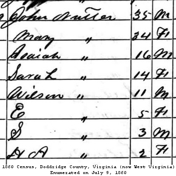 F Child 4: Elizabeth Nutter Born: Mar- 8-1854 27 Died: Feb-21-1862 in Doddridge Co, (W)VA 28 Cause of death: diphtheria 28 Census: 1860 in Doddridge Co, (W)VA