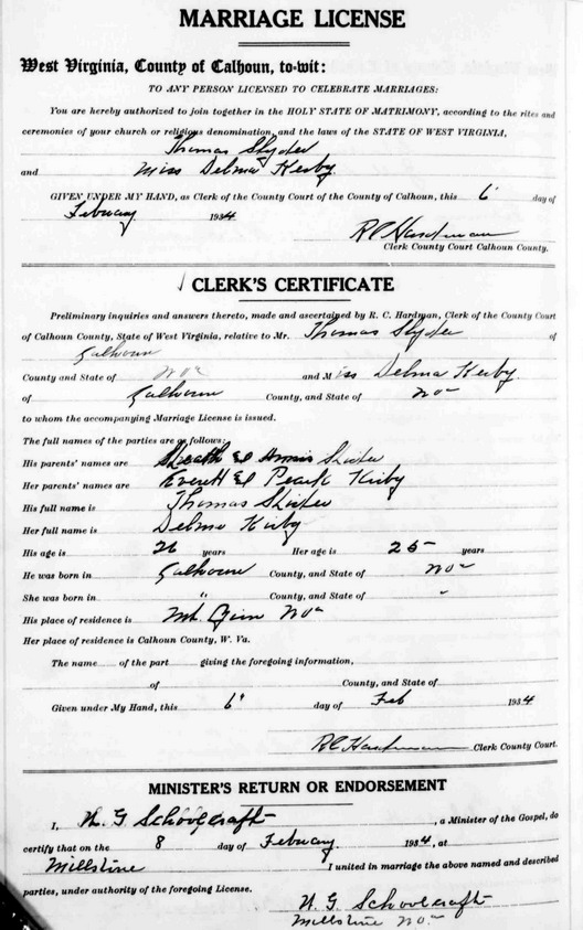 Sources: (1) Calhoun County WV Marriages 1927-1947, Wes Cochran, 2515 10th Ave, Parkersburg, WV 26101 (Jan 2005) (2) Calhoun County WV Marriages 1927-1947, Wes Cochran, 2515 10th Ave, Parkersburg, WV 26101 (Jan 2005), Identified as Thomas Slider, 26, of Calhoun Co, son of Salathiel & Annis; and Delma Kerby, 25, of Calhoun Co, dau of Everett & Pearl. Married Feb 8 1934. (Note: Bride's age 25 given at time of Feb 1934 marriage would put birth in about 1908 or 1909. But her parents were not married until 1914, and she does not appear in 1910 Census with her father and his first wife. The 1920 Census, in the household of her father and second wife (her mother) shows her age as 4.) (3) Calhoun County Marriage Records, Grantsville, WV. (4) 1920 Census, Calhoun County, WV. (5) Obituary of brother.Name Index
