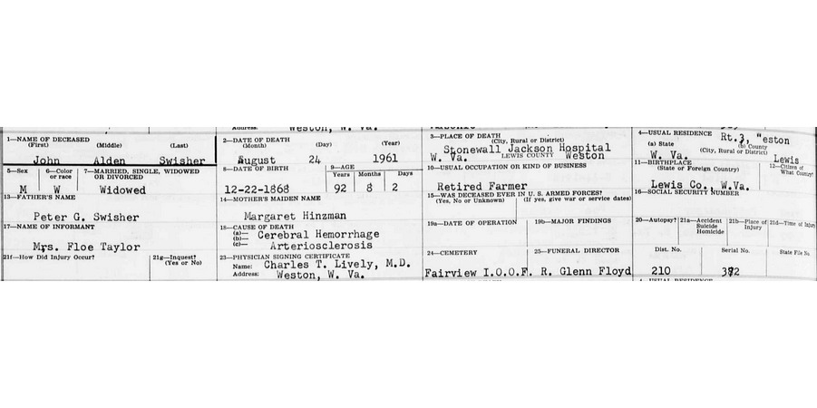 Jul-28-2018Husband: John Alden Swisher Born: Dec-22-1868 in Lewis Co, WV 1,2 Died: Aug-24-1961 in Weston, Lewis Co, WV 1 Buried: in Friendship Cemetery (Fairview IOOF), Berlin Rd (CR 7), Hackers Creek, Lewis Co, WV 1 Occupation: farmer 1 Father: Peter Gaston Swisher (1830 - 1913) Mother: Margaret Mary Hinzman (1832 - 1902)
