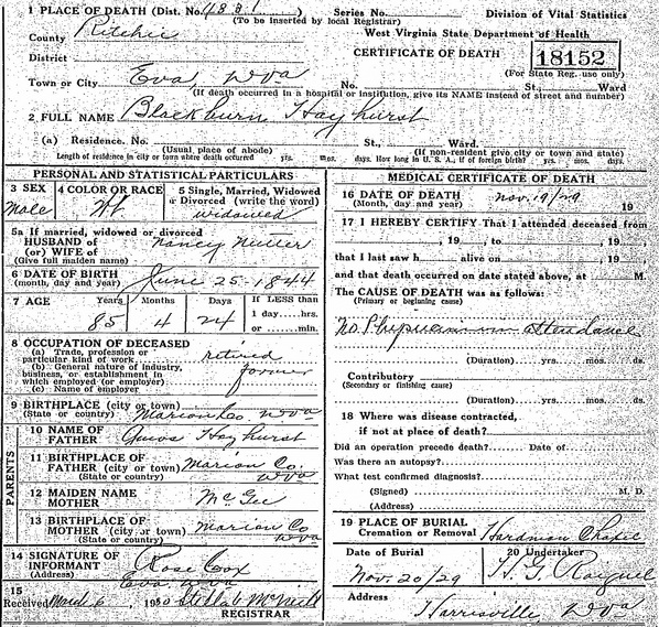 Jul-28-2018Husband: Blackburn B. Hayhurst Also known as: B. B. Hayhurst 1 Born: Jun-25-1844 in Marion Co, (W)VA 2 (see note 1) Died: Nov-19-1929 at Eva, Ritchie Co, WV 2,3 Buried: in Hardman Chapel Cemetery, Smithville, Ritchie Co, WV 2,4 Census: 1880 in Union District, Ritchie Co, WV Census: 1850, 1860 in Marion Co, (W)VA Occupation: farmer 2,5 Father: Amos Hayhurst (1799 - 1876) Mother: Mary McGee (1806 - )