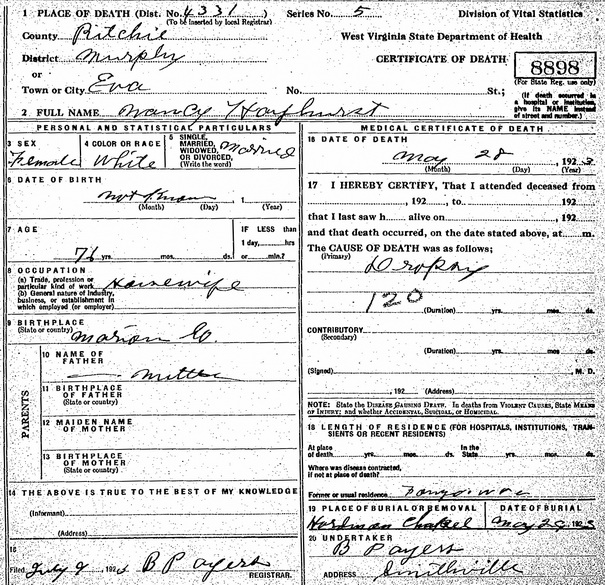 Wife: Nancy (Fancy) Nutter 1 Born: ca 1847 in Marion Co, (W)VA 2 Died: May-28-1923 at Eva, Ritchie Co, WV 2 Buried: in Hardman Chapel Cemetery, Smithville, Ritchie Co, WV 2 Father: Mother: Notes