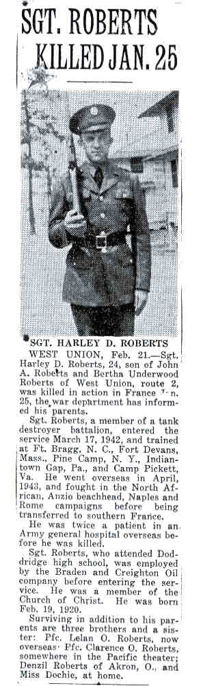 M Child 4: Stanley Roberts Born: ca 1919 7 Census: 1920 in Grant District, Doddridge Co, WV (see note 2)M Child 5: Harley Drexel Roberts Born: Feb-19-1920 in Morgansville, Doddridge Co, WV 8,11,13 Died: Jan-25-1945 in France 11,13 Buried: in Masonic Memorial Park Cemetery, Crystal Lake (West Union), WV 5 Census: 1940 at Nutters Fork, Doddridge Co, WV Census: 1930 in West Union District, Doddridge Co, WV Occupation: Braden & Creighton Oil Co. 11 Education: Doddridge Co H.S. (football team) 11 Military: (enlisted 3/28/1942) Sgt, US Army, World War II, Europe (killed in action) 17,11