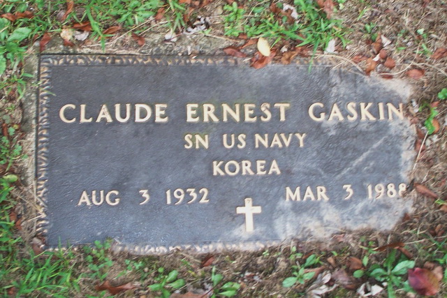 Jul-28-2018Husband: Claude Ernest "Ernie" Gaskins, Jr. Also known as: Ernest Gaskins 1 Born: Aug- 3-1932 at Little Flint, Doddridge Co, WV 2,3,4 Died: Mar- 3-1988 in Clarksburg, Harrison Co, WV 5,4 Buried: in Blockhouse Hill Cemetery (IOOF section), West Union, Doddridge Co, WV 2,6 Resided: in West Union, Doddridge Co, WV 2 Occupation: self-employed carpenter 2 Education: Doddridge Co H.S. Military: (enlisted 6/6/1951) SN, US Navy, USS Thomas E Fraser mine layer (Korean War) 4,2 Father: Claude E. Gaskins (1888 - 1949) Mother: Sarah Inez Reed (1897 - 1992) Other spouse 2