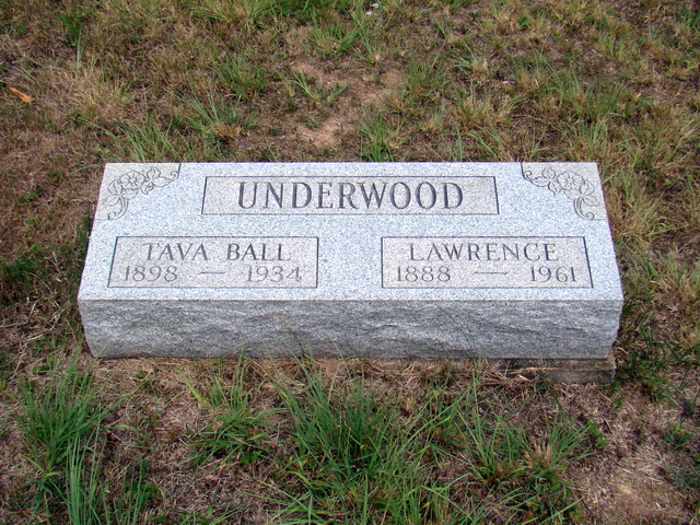 Born: Sep- 5-1888 in Doddridge Co, WV 1,2,3 Died: May- 2-1961 in Clarksburg, Harrison Co, WV 1 Buried: in Underwood Cemetery, near Ashley (Rt 23), Doddridge Co, WV 1 Census: 1940 at Ralphs Run (Center Point), Doddridge Co, WV Census: 1900, 10, 20, 30 in McClellan District, Doddridge Co, WV Occupation: farmer 4 Father: Freeman Underwood (1851 - 1929) Mother: Mary Jane Smith (1852 - 1914)Wife: Octava "Tava" Ball Also known as: Tava Ball 5,6 Married: Dec-23-1915 at Riggins Run, McClellan District, Doddridge Co, WV 3 (see note 1) Born: Jul- -1898 in Doddridge Co, WV 7,8,3 Died: 1934 8 Buried: in Underwood Cemetery, near Ashley (Rt 23), Doddridge Co, WV 9 Census: 1920, 1930 in McClellan District, Doddridge Co, WV Census: 1900 in Grant District, Doddridge Co, WV Father: Zacariah Taylor Ball (1856 - 1935) Mother: Emily Louisa Nuzum (1853 - 1924)