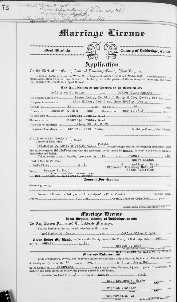 Jul-28-2018Husband: Arlington O. "Arley" Davis Also known as: Arley Davis 1,2,3,4,5 Born: Dec- 9-1891 in Greenbrier District, Doddridge Co, WV 6,7,3 Died: Jan-12-1978 at Long Run, Doddridge Co, WV 7 Buried: in Greenbrier 7th Day Bapt Cem, Co Rd 17, near Miletus, Doddridge Co, WV 8 Census: 1900, 1920, 1930 in Greenbrier District, Doddridge Co, WV Occupation: farmer 5 Father: James W. Davis (1857 - ) Mother: Nancy McCloy (1868 - 1952) Other spouse 2