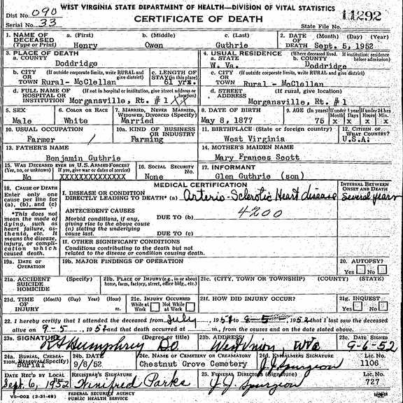 Jul-28-2018Husband: Henry Owen Guthrie Born: Mar- 8-1877 in Monongalia Co, WV 1,2 Died: Sep- 5-1952 in Morgansville, Doddridge Co, WV 2 Buried: in Chestnut Grove Cemetery, Big Flint, Doddridge Co, WV 2 Census: 1940 at Raygans Run, McClellan District, Doddridge Co, WV Census: 1930 at Neds Run, Big Flint, Doddridge Co, WV 3 Resided: 1923 in Morgansville, Doddridge Co, WV 4 Census: 1920 in McClellan District, Doddridge Co, WV Census: 1900 in Grant District, Doddridge Co, WV Occupation: farmer 2,3 Father: Benjamin Guthrie (1854 - 1933) Mother: Mary Frances Scott (1854 - 1934)