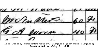 F Child 4: Nancy Nutter Born: Feb-22-1818 in Barbour Co, (W)VA 17 (see note 3) Died: Jun-29-1869 in Doddridge Co, WV 18,19,2 Census: 1850, 1860 in Doddridge Co, (W)VA Husband: William M. Watson b. ca 1818 d. Feb- 9-1890 Married: Oct-22-1840 in Harrison Co, (W)VA 20