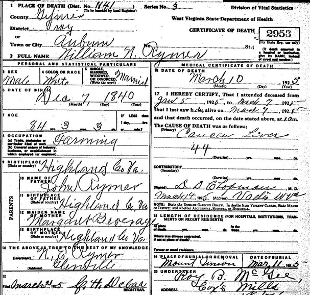 Jul-28-2018Husband: William W. Rymer Born: Dec- 7-1840 in Highland Co, VA 1,2,3,4 Died: Mar-10-1925 in Troy District, Gilmer Co, WV 1,3 Buried: in Mt. Union Cemetery, Straight Fork, Doddridge Co, WV 1,5 Census: 1900 in Troy District, Gilmer Co, WV Resided: 1869 in Gilmer Co, WV 4 Census: 1860 in Gilmer Co, (W)VA Occupation: farmer 1 Father: John M. Rymer (1822 - 1900) Mother: Margaret Beverage (1819 - 1887)