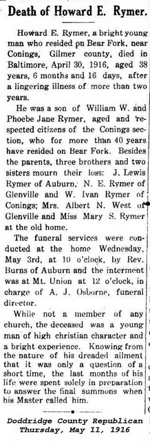 F Child 3: Mary S. Rymer Born: Nov- -1874 2 Resided: 1916 in Conings, Gilmer Co, WV 8 Census: 1900 in Troy District, Gilmer Co, WVM Child 4: Howard E. Rymer Born: Oct-14-1877 in Gilmer Co, WV 13,3 (see note 1) Died: Apr-30-1916 in Baltimore, MD 13,3 Buried: in Mt. Union Cemetery, Straight Fork, Doddridge Co, WV 13,5 Resided: near Conings, Gilmer Co, WV 13 Census: 1900 in Troy District, Gilmer Co, WV