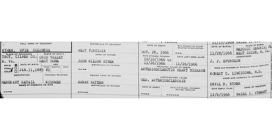 Jul-28-2018Husband: Opie Columbus Rymer Born: Jan-11-1885 in Gilmer Co, WV 1,2 Died: Nov-26-1966 in Wood Co, WV 3,4 Buried: in Masonic Memorial Park Cemetery, Crystal Lake (West Union), WV 3,5 Census: 1900, 1910, 1920 in Troy District, Gilmer Co, WV Occupation: retail merchant 3 Occupation: 1920 oil field worker 6 Father: John Wilson Rymer (1854 - 1929) Mother: Sarah E. Hayden (1866 - )