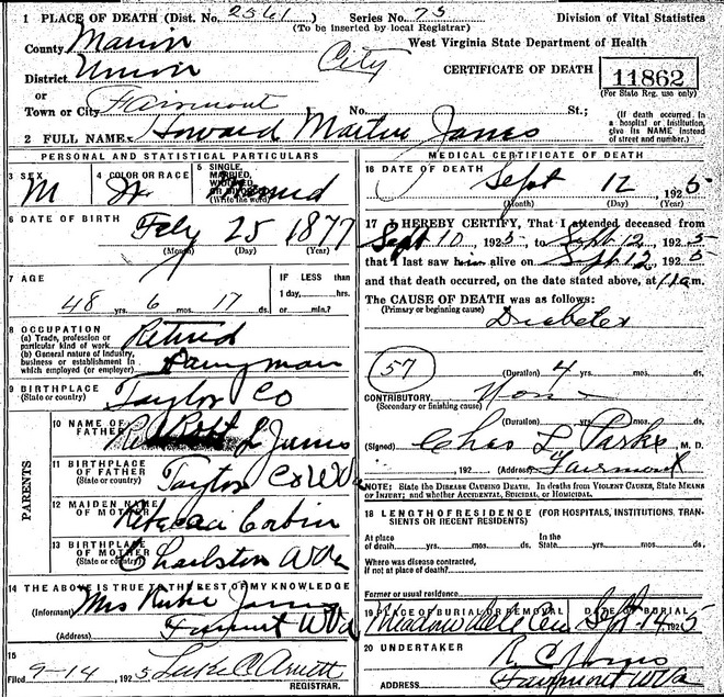 Sources: (1) WV State Dept of Health, Div of Vital Statistics, Death Certificate (http://www.wvculture.org/vrr/va_dcsearch.aspx) (2) Social Security Death Index. (3) Social Security Death Index, Social Security card issued in West Virginia in 1965. Name listed in SSDI as Ruby Janes. (4) Social Security Death Index, Social Security card issued in West Virginia before 1951.Name Index