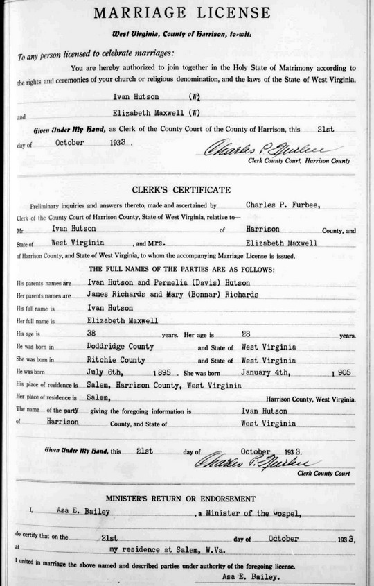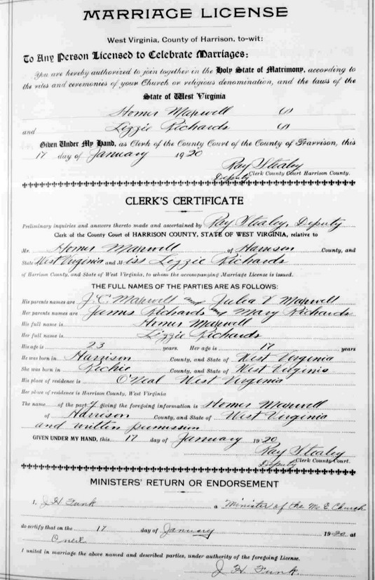 Wife: Elizabeth Mae "Lizzie" Richards Also known as: Lizzie Richards 2,3,4 Married: Jan-17-1920 at O'Neill, Harrison Co, WV 2 Born: Jan- 4-1905 in Ritchie Co, WV 2 Resided: 1933 in Salem, WV 2 Census: 1930 in Tenmile District, Harrison Co, WV Resided: 1920 in Harrison Co, WV 2 Father: James Richards (1875 - ) Mother: Mary Ellen Bonar (1866 - ) Other spouse 2
