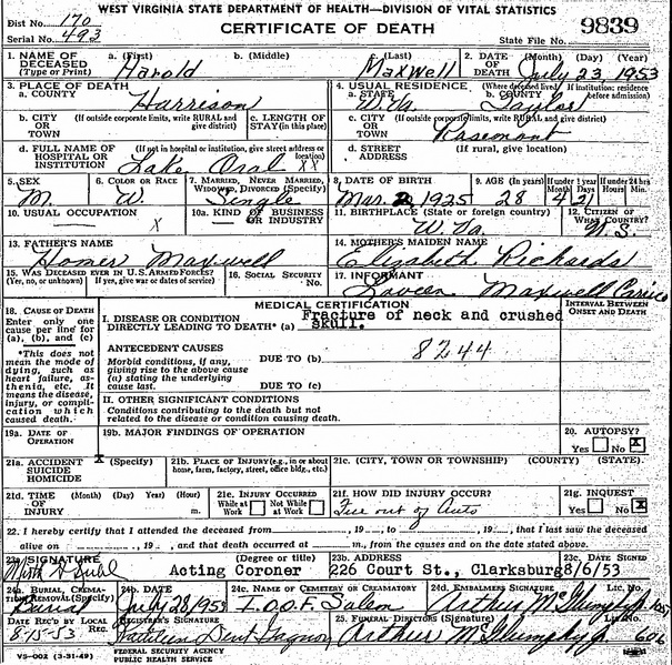 M Child 1: Harold Maxwell Born: Mar- 2-1925 1 Died: Jul-23-1953 in Harrison Co, WV 1 Buried: in IOOF Cemetery, Salem, Harrison Co, WV 1 Cause of death: fell out of automobile 1 Resided: in Rosemont, Taylor Co, WV 1 Census: 1930 in Tenmile District, Harrison Co, WV Never married: 1