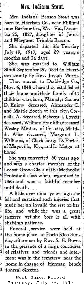 Sources: (1) 1850 Census, Doddridge County, (W)VA. (2) Death record of daughter. (3) Obituary of wife. (4) Obituary. (5) WV State Dept of Health, Div of Vital Statistics, Death Certificate (http://www.wvculture.org/vrr/va_dcsearch.aspx) (6) Obituary, Obituary states death date as Tuesday, July 19 1917. But that date fell on a Thursday. Death record shows date of death as July 19 1917. West Union Record, Jul 26 1917. (7) 1900 Census, Doddridge County, WV (New Milton District) (8) Headstone (year only) (9) Obituary - At home. (10) Doddridge County WV Deaths 1853-1969, Wes Cochran, 156 Gihon Meadows, Apt 150, Parkersburg, WV 26101. (11) West Union WV Cemeteries (Doddridge County), Wes Cochran, 2515 10th Ave, Parkersburg, WV 26101 (July 1990) (12) Birth record of son. (13) Doddridge County WV Marriages 1845-1937, Wes Cochran, 156 Gihon Meadows, Apt 150, Parkersburg, WV 26101 (Jan 1993) (14) Headstone. (15) Obituary - Hospital. (16) West Union WV Cemeteries (Doddridge County), Wes Cochran, 2515 10th Ave, Parkersburg, WV 26101 (July 1990), Headstone reads: A. C. Stout, 1849 - 1936. (17) Obituary of mother. (18) Marriage record of son. (19) Doddridge County Marriage Records, West Union, WV. (20) Doddridge County Marriage Records, West Union, WV, Identified as Wm. W. Booth, age 23y 5m, b. & res. in Harrison Co, farmer, son of Huston & Ingabe Booth; and Marsavene Stout, age 18y 2m, b. & res. in Doddridge Co, dau of William & Indianna Stout. Married Sep 1 1870 in Doddridge County. MR p. 172, line 17 : www.wvculture.org/vrr/va_view.aspx?Id=11791708&Type=Marriage. (21) Death Record - Birth date calculated from age at death. (22) 1860 Census, Doddridge County, (W)VA. (23) 1900 Census, Lewis County, WV. (24) 1870 Census, Doddridge County, WV (South West Twp). (25) Obituary of sister. (26) Birth record of daughter. (27) 1940 Census, Doddridge County, WV (Southwest District) (28) Death record of wife. (29) 1930 Census, Doddridge County, WV (West Union District). (30) 1920 Census, Doddridge County, WV (West Union District). (31) Doddridge County Death Records, West Union, WV. (32) 1900 Census, Doddridge County, WV (Southwest District) (33) Lewis County Marriage Records, Weston, WV. (34) Kentucky Death Index, 1911-2000 [database on-line], Ancestry.com and Kentucky Health Data Branch. (35) Kentucky Death Index, 1911-2000 [database on-line], Ancestry.com and Kentucky Health Data Branch, Mother incorrectly identified as Indiana Vincent, rather than Indiana Benson. (36) Death record. (37) Findagrave.com. (38) Obituary of son. (39) 1930 Census. (40) 1900 Census, Doddridge County, WV (West Union District) (41) Ritchie County Marriage Records, Harrisville, WV. (42) Ritchie County Marriage Records, Harrisville, WV, Identified as L. M. Stout, 32, b. Doddridge Co, res. Kelly, Doddridge Co, son of (blank); and Miss Lettie Wilson, 21, b. Ritchie Co, res. Pennsboro, dau of (blank). Married Apr 1 1903 in Pennsboro. MR p. 352. (43) Obituary of husband. Event Notes Note (1) Stone has birth date, but no death date. Name reported as Sendora D. Note (2) In 1910, listed as a boarder, age 61, widowed, farmer, in the household of Henson Knapp and his extended family. Note (3) At 103 Court Street. Only other household member was son Houston. Note (4) In 1920 and 1930, at 407 Wood Street. Note (5) Birth date on headstone is Oct 6 1873, but his death record states Oct 6 1868. He was present (age 1) for the 1870 Census. In his later adult years, his reported age was only about 8 years older than the previous census.Name Index