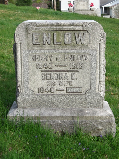 Jul-28-2018Husband: Henry J. Enlow Also known as: John H. Enlow 1 Born: Mar- 5-1845 in Athens Co, OH 2,3,4,5 Died: Apr-10-1913 in Doddridge Co, WV 6,3 Buried: in Blockhouse Hill Cemetery (IOOF section), West Union, Doddridge Co, WV 7 Census: 1900 in New Milton District, Doddridge Co, WV Census: 1880 in Southwest District, Doddridge Co, WV Census: 1870 in New Milton District, Doddridge Co, WV Resided: 1869 in Doddridge Co, WV 5 Occupation: teacher Occupation: 1870, 1880, 1900 farmer 8,9,4 Military: 8th Ohio Inf, Civil War 2 Father: Abram Enlow Mother: Nancy ___