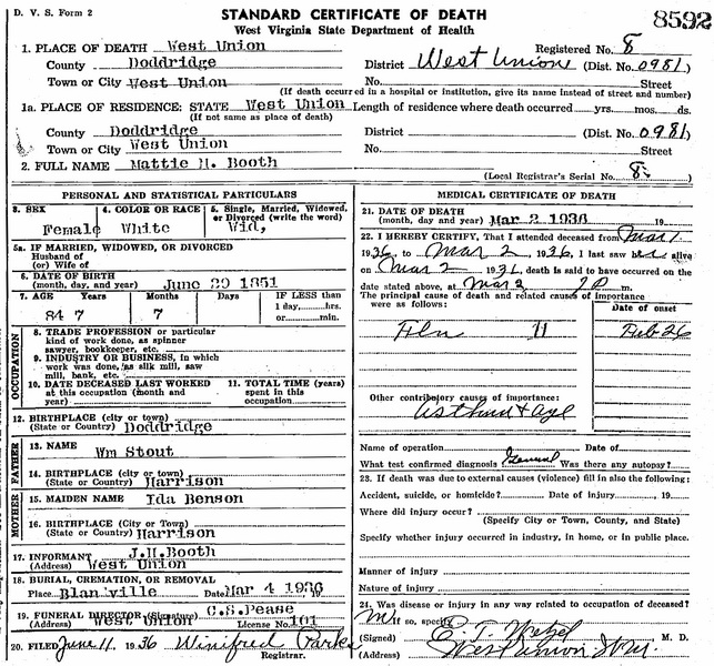 Born: Apr- -1845 in Harrison Co, (W)VA 1,2 Census: 1880, 1900 in New Milton District, Doddridge Co, WV Resided: 1870 in Harrison Co, WV 2 Occupation: farmer 3,1 Father: Huston Booth Mother: Ingabe ThompsonWife: Marsavene "Mattie" Stout 4,5 Also known as: Mattie Stout 6,7,8 Married: Sep- 1-1870 in Doddridge Co, WV 9 Born: Jun-20-1851 in Doddridge Co, (W)VA 8,1,2 Died: Mar- 2-1936 in West Union, Doddridge Co, WV 8 Buried: in Blandville Cemetery, Doddridge Co, WV 8 Census: 1920, 1930 in West Union, Doddridge Co, WV (see note 1) Resided: 1915, 1917 in West Union, Doddridge Co, WV 6 Census: 1880, 1900 in New Milton District, Doddridge Co, WV Census: 1870 in Southwest District, Doddridge Co, WV Father: William Stout (1818 - ) Mother: Indiana Benson (1827 - 1917) Notes