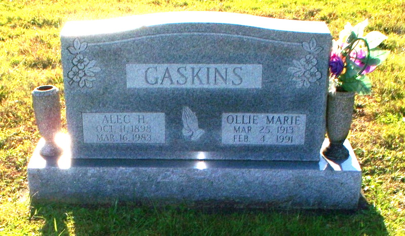 Sources: (1) Doddridge County Marriage Records, West Union, WV. (2) 1920 Census, Doddridge County, WV (West Union District). (3) 1930 Census, Harrison County, WV. (4) Doddridge County Marriage Records, West Union, WV, Identified as George H. Gaskins, 27, b. & res. in Doddridge Co; and Sarah A. McGill, 17, b. & res. in Doddridge Co. Married Aug 13 1900 "at the groom's home." Informants for marriage license: George A. (sic) Gaskins & William McGill. (Note: This couple's entry in the 1910 Census stated that they had been married for 14 years. West Virginia Births Index reflects the birth of their son Alec on Oct 11 1898, father George H. Gaskins, age 25, and mother Sarah A. McGill, age 17. Basis for these discrepancies is not known.), MR p. 239 : http://www.wvculture.org/vrr/va_view.aspx?Id=11793453&Type=Marriage. (5) West Virginia Births Index, 1853-1969 [database on-line], Ancestry.com. (6) Obituary. (7) WV State Dept of Health, Div of Vital Statistics, Death Certificate (http://www.wvculture.org/vrr/va_dcsearch.aspx), http://www.wvculture.org/vrr/va_view.aspx?Id=170327&Type=Death. (8) Obituary - At home. (9) National Archives and Records Administration, World War I Draft Registration Cards, 1917-1918 (Ancestry.com online database) (10) Social Security Death Index. (11) Headstone. (12) West Union WV Cemeteries (Doddridge County), Wes Cochran, 2515 10th Ave, Parkersburg, WV 26101 (July 1990) (13) Findagrave.com. (14) 1940 Census, Doddridge County, WV (West Union District) (15) U.S. Department of Veterans Affairs BIRLS Death File, 1850-2010 [database on-line], Ancestry.com. (16) Headstone (year only) (17) Doddridge County Marriage Records, West Union, WV, at the Smithburg M.E. Parsonage. (18) Death Record - Online. (19) Social Security Death Index, Social Security card issued in Ohio before 1951. (20) Obituary of sister. (21) Obituary of brother. (22) 1910 Census, Doddridge County, WV (Grant District). (23) Death record of wife. (24) Ohio Deaths, 1908-1932, 1938-1944, and 1958-2007 (online), Ancestry.com and Ohio Department of Health. (25) Obituary - Hospital. (26) U.S. Public Records Index, Vol 2, Ancestry.com. (27) Military Grave Marker. (28) Social Security Applications and Claims Index, 1936-2007 [database on-line], Ancestry.com. (29) Social Security Death Index, Social Security card issued in West Virginia before 1951. (30) Braxton County Marriage Records, Sutton, WV, http://www.wvculture.org/vrr/va_view.aspx?Id=10239819&Type=Marriage. (31) WV State Dept of Health, Div of Vital Statistics, Death Certificate (http://www.wvculture.org/vrr/va_dcsearch.aspx) Event Notes Note (1) Alec H. Gaskins and his sister Ollie M. Gaskins share a common headstone. Note (2) Listed as a lodger, 42, single, farm laborer, in household of Ephraim H. & Delphia (Davisson) Smith.Name Index