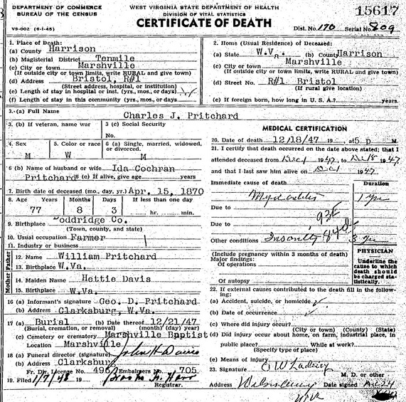 Jul-28-2018Husband: Charles J. Pritchard 1 Born: Apr-15-1870 in Doddridge Co, WV 2,3 Died: Dec-18-1947 in Marshville, Harrison Co, WV 2,3 Buried: in Marshville Cemetery, Harrison Co, WV 4 Resided: in Marshville, Harrison Co, WV 2 Census: 1900 in Clay District, Ritchie Co, WV Resided: 1896 in Ritchie Co, WV 5 Census: 1880 in Jackson Co, WV Census: 1870 in New Milton District, Doddridge Co, WV Occupation: farmer 2 Father: William Tyler Pritchard (1830 - 1911) Mother: Hester Davis (1834 - 1925)