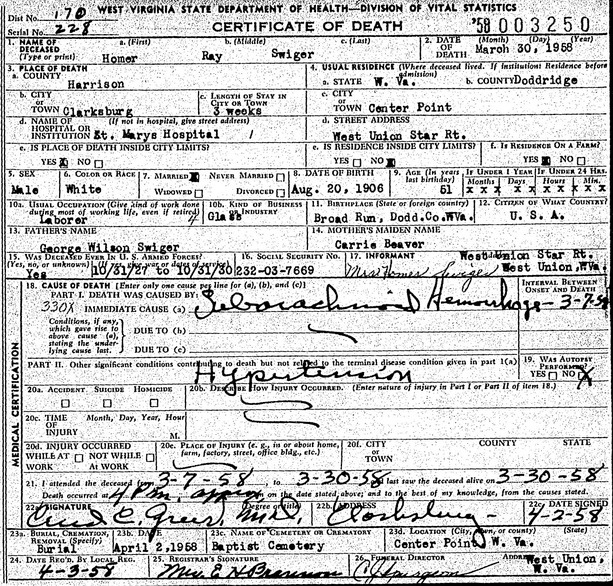 Jul-28-2018Husband: Homer Ray Swiger Born: Aug-20-1906 in Doddridge Co, WV 1,2 Died: Mar-30-1958 in Clarksburg, Harrison Co, WV 1 Buried: in Pleasant Baptist Church Cemetery, Center Point, Doddridge Co, WV 1 Resided: at Center Point, Doddridge Co, WV 1 Resided: 1933 in Ashley, Doddridge Co, WV 2 Census: 1910, 1920 in McClellan District, Doddridge Co, WV Occupation: glass worker 1 Military: Oct-31-1927 - Oct-31-1930 U.S. Armed Forces 1 Father: George Wilson Swiger (1869 - 1954) Mother: Carrie Jane Beaver (1872 - 1956)