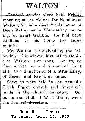 Jul-28-2018Husband: Henderson Walton Also known as: Henry Walton 1 Born: Apr- -1864 in Braxton Co, WV 2,3 Died: Apr-17-1935 at Deep Valley (Greenwood), Doddridge Co, WV 4 Buried: in Pigott-Hiley Cemetery, Central Station, Doddridge Co, WV 5 Resided: at Deep Valley (Greenwood), Doddridge Co, WV 5 Census: 1880, 1900, 10, 20 in Troy District, Gilmer Co, WV Father: Mother: