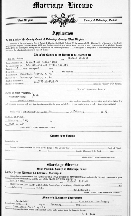 Wife: Mildred Waneta Elliott Census name: Waneta Elliott 5 Married: Feb- 4-1943 in West Union, Doddridge Co, WV 2
