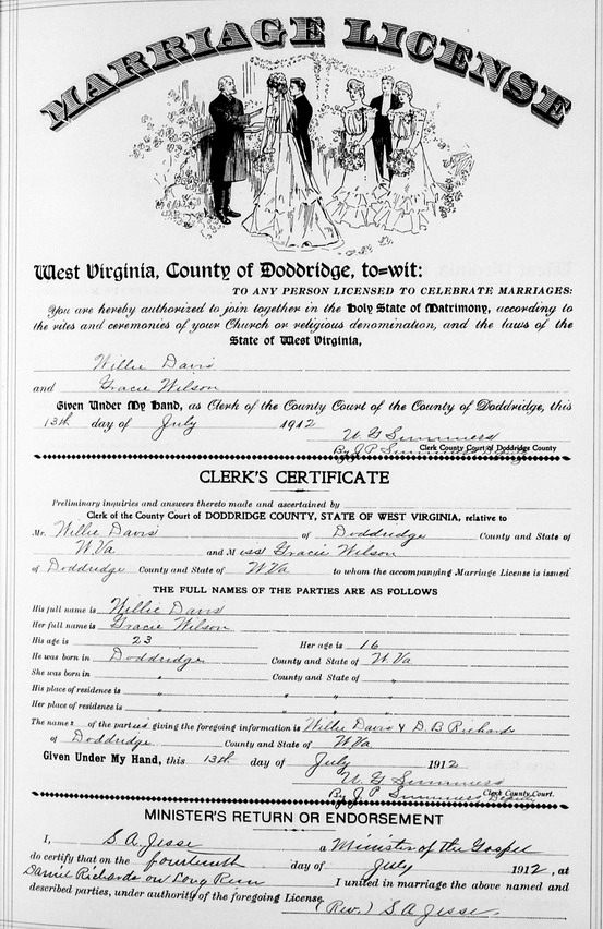 Wife: Grace Matilda Wilson 2 Also known as: Gracie Wilson 1 Married: Jul-14-1912 at Long Run, Doddridge Co, WV 1