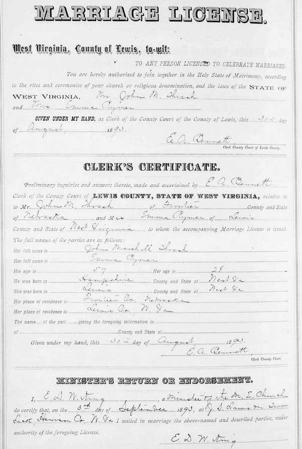 Jul-28-2018Husband: John Marshall Thrash Born: May- 9-1836 in Hampshire Co, (W)VA 1,2 Died: Jul-17-1910 at Good Hope, Harrison Co, WV 3,1 Buried: in Good Hope Masonic Cemetery, Rt. 19 S, Harrison Co, WV 4 Resided: 1893 in Frontier Co, NE 2 Occupation: farmer 3 Father: Mother: