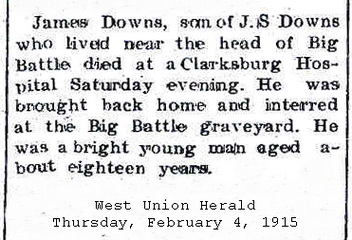 M Child 4: Boyd Permetus Downs Born: Jan- 2-1904 in Center Point, Doddridge Co, WV 11 Died: Jan-23-1946 12 Buried: in Big Battle Cemetery, Doddridge Co, WV 12,13 Census: 1910, 1920 in McClellan District, Doddridge Co, WV Wife: Frankie ___