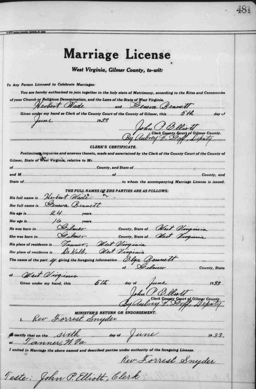 Jul-28-2018Husband: Herbert Bryan Wade Born: Feb-28-1909 in Gilmer Co, WV 1,2 Died: Aug- -1984 1 Resided: at Tanner, Gilmer Co, WV 3 Resided: 1942 in Glenville, Gilmer Co, WV 4 Father: Bernie Wade (1876 - ) Mother: Lenora Hannah Riddle (1872 - 1942) Other spouse 1