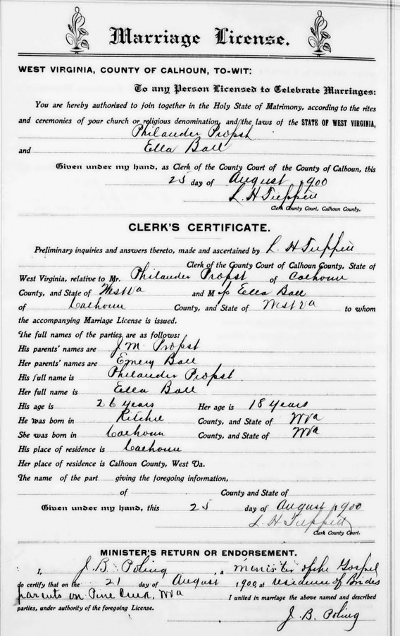 Wife: Ella Ball Married: Aug- -1900 in Calhoun Co, WV 3