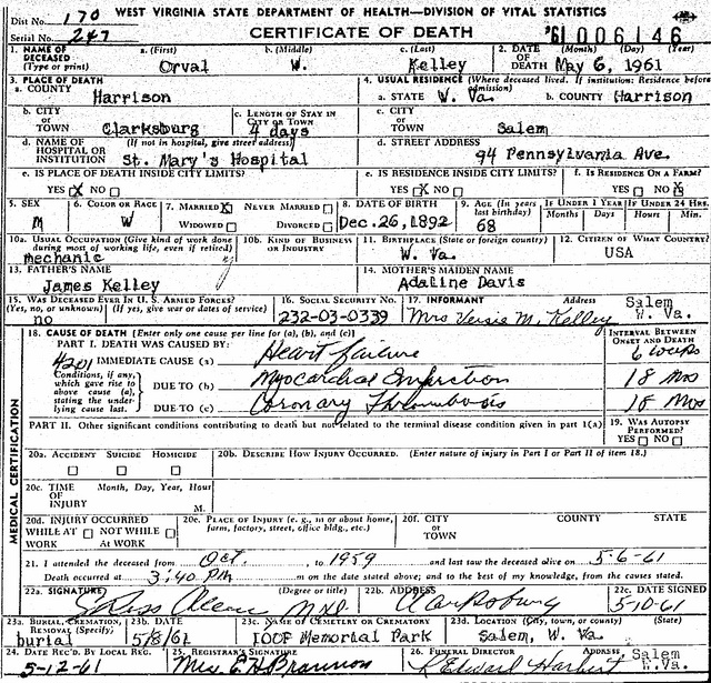 Jul-28-2018Husband: Orval Waldo Kelley Born: Dec-26-1892 in Doddridge Co, WV 1,2,3 (see note 1) Died: May- 6-1961 in Clarksburg, Harrison Co, WV 1 Buried: in IOOF Cemetery, Salem, Harrison Co, WV 1 Resided: 94 Pennsylvania Ave in Salem, Harrison Co, WV 1 Census: 1900 in Greenbrier District, Doddridge Co, WV Occupation: mechanic 1 Father: James Kelley (1850 - 1920) Mother: Delila Adeline Davis (1850 - 1922)