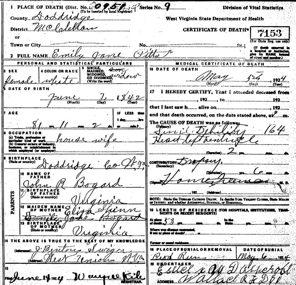 Born: Apr-22-1843 in Tyler Co, (W)VA 1,2 Died: Dec- 1-1917 in Shirley, Tyler Co, WV 1 Buried: in Shirley Cemetery, Shirley, Tyler Co, WV 1 Census: 1900 in McClellan District, Doddridge Co, WV Resided: 1888 in Doddridge Co, WV Census: 1880 in McClellan District, Doddridge Co, WV Resided: 1866 in Doddridge Co, WV 2 Census: 1850 in Tyler Co, (W)VA Occupation: farmer 1,2 Father: John Pitts (1817 - ) Mother: Margaret Gatrell (1816 - ) Other spouse 1 Other spouse 2Wife: Emily Jane Bogard Married: Dec-17-1888 in Doddridge Co, WV 2 Born: Jun- 7-1842 in Doddridge Co, (W)VA 1,3 (see note 1) Died: May- 5-1924 in McClellan District, Doddridge Co, WV 1 Buried: in Swiger (aka Broad Run) Cemetery, near Ashley, Doddridge Co, WV 1,4 Census: 1880, 1900, 1920 in McClellan District, Doddridge Co, WV Census: 1850, 1860 in Doddridge Co, (W)VA Father: John R. Bogard (1821 - 1864) Mother: Eliza Shinn (1819 - 1858) Other spouse 1