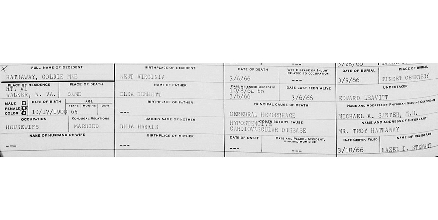 Born: ca 1895 in Calhoun Co, WV 1 Resided: 1916 in Calhoun Co, WV 1 Father: Mother:Wife: Goldie Mae Bennett Married: May-23-1916 near Stumptown, Gilmer Co, WV 1 Born: Oct-17-1900 in Gilmer Co, WV 2,1 Died: Mar- 6-1966 in Walker, Wood Co, WV 3 Buried: in Sunset Memory Gardens, Parkersburg, Wood Co, WV 3 Resided: in Walker, Wood Co, WV 3 Resided: 1916 in Calhoun Co, WV 1 Census: 1910 in DeKalb District, Gilmer Co, WV Father: Lewis Ellsworth "Elza" Bennett (1879 - ) Mother: Renah Harris (1882 - 1903)