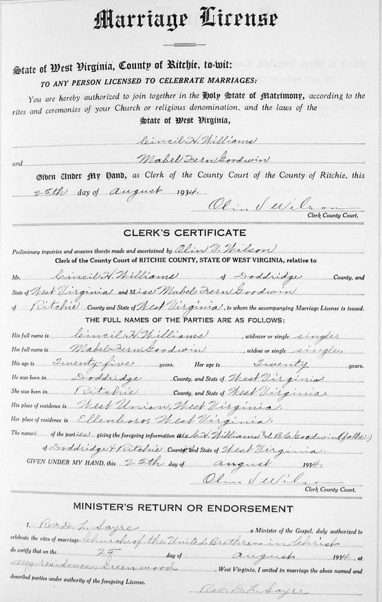 Jul-28-2018Husband: Cincil H. Williams Census name: Cencil Williams 1 Born: Aug- 9-1909 in West Union, Doddridge Co, WV 2,3,4 Died: Mar-11-1994 4 Buried: in Freeman-Coleman Cemetery, Rt 18 N (Crystal Lake), West Union, WV 5 Resided: in West Union, Doddridge Co, WV 6 Resided: 1947 at Toll Gate, Ritchie Co, WV 7 Census: 1940 at Cabin Run, Doddridge Co, WV 8 Census: 1920, 1930 in Central District, Doddridge Co, WV 9 Father: William Henry Williams (1870 - 1947) Mother: Temperance Genevra Garner (1881 - 1959) Other spouse 2