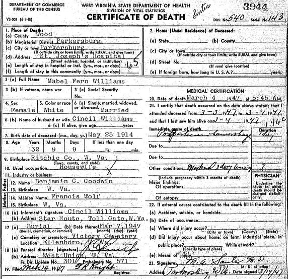 Wife: Mabel Fern Goodwin Married: Aug-25-1934 at Greenwood, Doddridge Co, WV 10 Born: May-25-1914 in Ritchie Co, WV 11,10 Died: Mar- 4-1947 in Parkersburg, Wood Co, WV 11 Buried: in Victory Ridge Cemetery, CR 16/8, north of Harrisville, Ritchie Co, WV 12,11 Census: 1940 at Cabin Run, Doddridge Co, WV 8 Resided: 1934 in Ellenboro, Ritchie Co, WV 10 Census: 1930 in Grant District, Ritchie Co, WV Census: 1920 in Cornwallis, Ritchie Co, WV Father: Benjamin C. Goodwin (1883 - 1962) Mother: Frances Cleveland Wolfe (1888 - 1941)