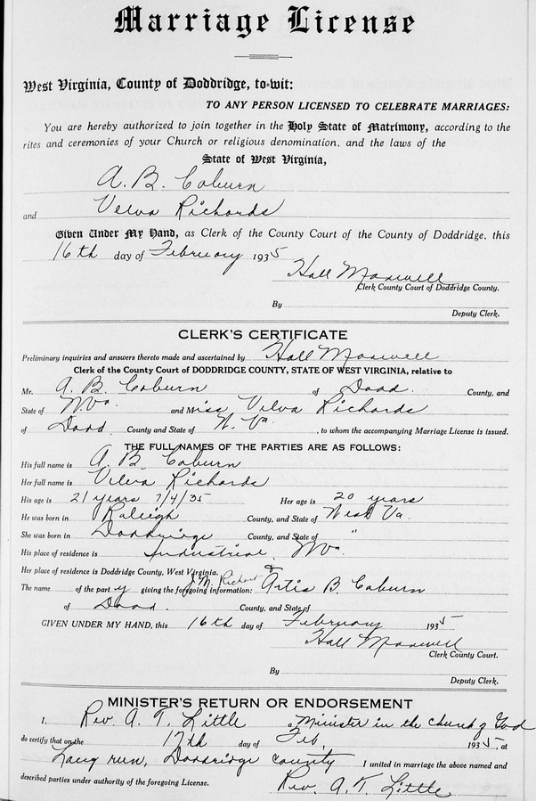 Sources: (1) Social Security Death Index. (2) Doddridge County Marriage Records, West Union, WV. (3) Social Security Death Index, Social Security card issued in West Virginia before 1951. (4) 1920 Census, Doddridge County, WV (Grant District). (5) Doddridge County Marriage Records, West Union, WV, Identified as A. B. Coburn, age 21 as of 7/4/35, b. in Raleigh Co WV, res. in Industrial WV; and Miss Velva Richards, 20, b. & res. in Doddridge Co. Married Feb 17 1935 at Long Run in Doddridge County. Informants for marriage license: J. M. Richards & Artis B. Coburn. MR p. 263. (6) Headstone. (7) Cemeteries of Tenmile District, Harrison County, WV, Harrison County Genealogical Society, Clarksburg, WV (1989, revised 1995) (8) Marion County Marriage Records, Fairmont, WV. Event Notes Note (1) Birth date given as Jul 4 1914 in marriage record, but SSDI shows it as Jul 1 1914. Note (2) Age 3 at 1920 Census would put birth in about 1916/17, while age 14 at 1930 Census would it in about 1916, and age 20 at Feb 1935 marriage would put birth in 1914 or 1915. Birth date given as Aug 12 1916 in 1948 marriage record, Aug 12 1914 on headstone, and Aug 12 1910 in SSDI.Name Index
