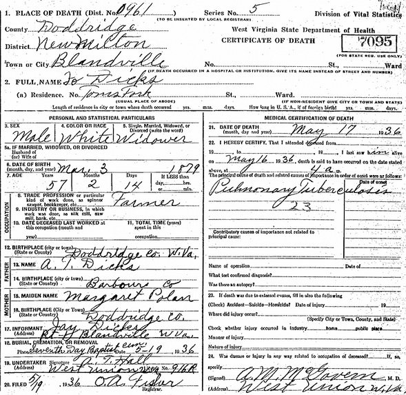 Jul-28-2018Husband: I. O. Dicks Born: Mar- 3-1879 in Doddridge Co, WV 1,2 Died: May-17-1936 at Blandville, Doddridge Co, WV 3 Buried: in Middle Island 7th Day Bapt Cem, Sugar Camp, New Milton, Doddridge Co WV 1,4 Cause of death: pulmonary tuberculosis 1 Resided: at Toms Fork, Porto Rico, Doddridge Co, WV 1 Resided: at Market, Doddridge Co, WV 2 Census: 1930 in West Union, Doddridge Co, WV (see note 1) Census: 1910, 1920 in New Milton District, Doddridge Co, WV Occupation: farmer 1 Occupation: 1930 building contractor 5 Occupation: 1920 farmer 6 Father: Andrew T. Dicks (1844 - 1903) Mother: Margaret V. Polan (1855 - 1897)