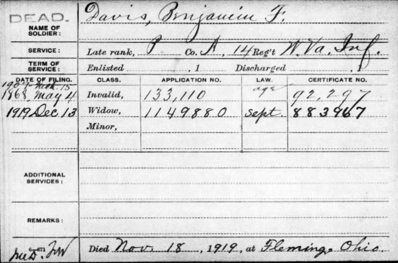 Sources: (1) Military Grave Marker. (2) Tyler County Marriage Records, Middlebourne, WV, MR p. 15, Line 19 : http://www.wvculture.org/vrr/va_view.aspx?Id=12038049&Type=Marriage. (3) Ohio Deaths, 1908-1932, 1938-1944, and 1958-2007 (online), Ancestry.com and Ohio Department of Health. (4) Findagrave.com. (5) 1900 Census, Ritchie County, WV (Grant District) (6) 1910 Census. (7) 1880 Census, Pleasants County, WV. (8) Historical Military Records, www.fold3.com. (9) Death record of daughter. (10) Headstone (year only) (11) 1870 Census, Doddridge County, WV (West Union Twp). (12) West Virginia Marriages Index, 1785-1971 [database on-line], Ancestry.com. (13) Ritchie County Marriage Records, Harrisville, WV. (14) WV State Dept of Health, Div of Vital Statistics, Death Certificate (http://www.wvculture.org/vrr/va_dcsearch.aspx) (15) Ritchie County Death Records, Harrisville, WV. Event Notes Note (1) The Ohio Death Index show that Benjamin F. Davis died in Fleming, Washington County, Ohio, on Nov 18 1919. This date corresponds to the death date on his military grave marker, his civilian grave marker, and his Civil War pension index card. There was also an entry made by the County Assessor in the Ritchie County death records to reflect the same place of death, but with the date indicated as Nov 18 1920. Note (2) Benjamin F. Davis' Military unit is given in H. H. Hardesty's "History of Doddridge County" (1883) as Co A, 14th W.Va. Infantry, as does his Civil War pension index card. But his military grave marker shows it as Co F, 6th W.Va. Infantry, which is actually the unit of a different Benjamin Daivs, who died in Rowlesburg in 1920. Note (3) Age in marriage record would put birth in about 1844.Name Index