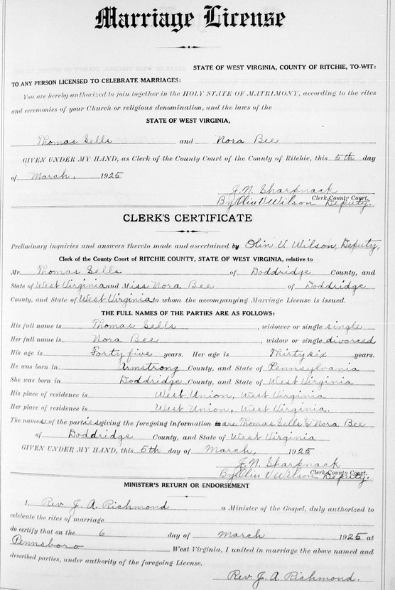 Wife: Lenora "Nora" Bee Also known as: Nora Bee 1,2 Married: Mar- 6-1925 in Pennsboro, Ritchie Co, WV 3