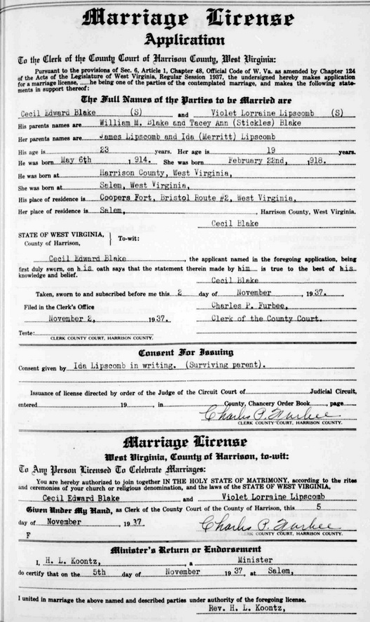 Jul-28-2018Husband: Cecil Edward Blake Born: May- 6-1914 at Coburns Fork (Jarvisville), Harrison Co, WV 1,2,3 Died: Oct-11-1999 at Sawyers Run (Salem), Harrison Co, WV 4,3 Buried: in IOOF Cemetery, Salem, Harrison Co, WV 2,5 Resided: at Sawyers Run (Salem), Harrison Co, WV 2,6 Resided: 1937 in Bristol, Harrison Co, WV 1 Occupation: PPG Industries (25 yrs) 2 Father: William Blaine "Will" Blake (1885 - 1972) Mother: Tacy Ann Stickle (1882 - 1956) Other spouse 2