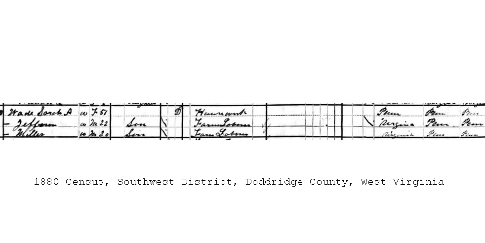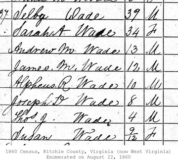 M Child 5: Thomas Jefferson Wade Also known as: Jefferson Wade 16 Born: ca 1856 in Ritchie Co, WV 17 Census: 1880 in Southwest District, Doddridge Co, WV Census: 1870 in Union District, Ritchie Co, WV Census: 1860 in Ritchie Co, (W)VA