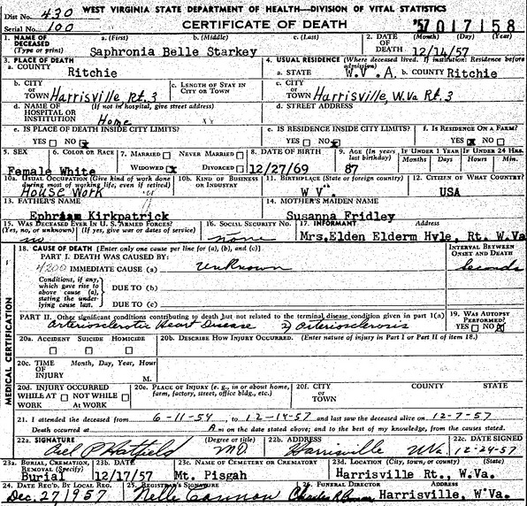 Sources: (1) WV State Dept of Health, Div of Vital Statistics, Death Certificate (http://www.wvculture.org/vrr/va_dcsearch.aspx) (2) Headstone (year only) (3) Ritchie County Marriage Records, Harrisville, WV. (4) Ritchie County Historical Society (David M. Scott, Editor), Ritchie County, West Virginia Cemeteries through 1993, McClain Printing Co, Parsons, WV, 1995. (5) Death record of son. (6) Death record of husband. (7) Ritchie County Marriage Records, Harrisville, WV, Identified as A. B. Starkey, 23, b. & res. in Ritchie Co; and S. B. Kirkpatrick, 19, b. & res. in Ritchie Co. Married Nov 24 1889 in Ritchie County. MR p. 70 : http://www.wvculture.org/vrr/va_view.aspx?Id=11539875&Type=Marriage. (8) Ritchie County Death Records, Harrisville, WV. (9) Findagrave.com. (10) 1930 Census, Ritchie County, WV (Clay District).Name Index