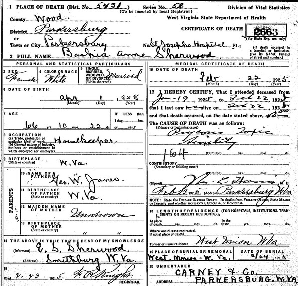 Born: Oct- -1857 in Virginia (now West Virginia) 2 (see note 1) Died: Oct-27-1897 in Blandville, Doddridge Co, WV 1 Buried: in Cowan Cemetery, Georges Camp, Blandville, Doddridge Co, WV Cause of death: "poison of morphine" 1 Census: 1870, 1880 in New Milton District, Doddridge Co, WV Census: 1860 in Doddridge Co, (W)VA Occupation: surveyor 1 Occupation: 1880 farmer 3 Father: Samuel Todd Sherwood (1828 - 1900) Mother: Drusilla Bland (1834 - 1913)Wife: Basha Ann Janes 4 Also known as: Barbra 5 Born: Apr- 1-1858 in Virginia (now West Virginia) 6,7 Died: Feb-22-1925 in Parkersburg, Wood Co, WV 6 Buried: in Cowan Cemetery, Georges Camp, Blandville, Doddridge Co, WV 8 Census: 1880, 1900 in New Milton District, Doddridge Co, WV Father: George W. Janes (1833 - ) Mother: Almira R. Archy (1839 - ) Notes