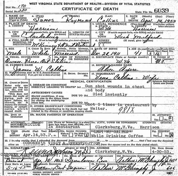 Jul-28-2018Husband: James Raymond Collins Born: Dec-28-1911 1 Died: Apr-14-1953 in Clarksburg, Harrison Co, WV 1 Buried: in Greenlawn Masonic Cemetery, Clarksburg, Harrison Co, WV 1 Cause of death: homicide (shot by waiter in a restaurant) 1 Resided: in West Milford, Harrison Co, WV 1 Resided: 1931 in Clarksburg, Harrison Co, WV 2 Occupation: owner of Pure Oil service station 1 Father: James W. Collins Mother: Alice Ayers Other spouse 1