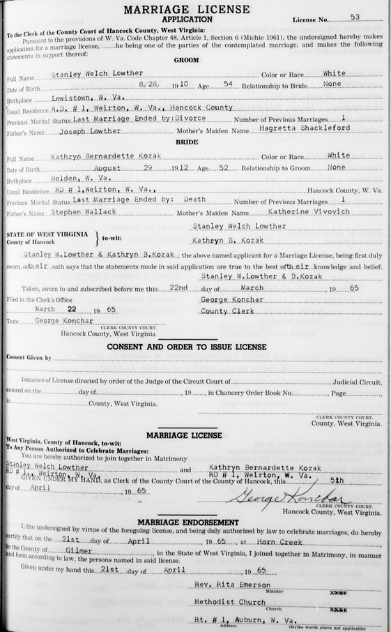 Jul-28-2018Husband: Stanley Welsh Lowther Also known as: Stanley Welch Lowther 1 Born: Aug-28-1910 1,2,3 Died: Apr-21-1968 in Weirton, Hancock Co, WV 4,2,3 Buried: in Spurgeon (aka Pleasant Valley or Dunkard) Cem, Bear Fork (Co Rd 62/2), Doddridge/Gilmer Co, WV 5,4 Resided: in Weirton, Hancock Co, WV 4,1 Census: 1940 in Cove District, Doddridge Co, WV Occupation: patcher in steel mill 4 Occupation: 1940 farmer 6 Father: Joseph Thomas Lowther (1871 - 1949) Mother: Hagar Etta Shackleford (1877 - ) Other spouse 2